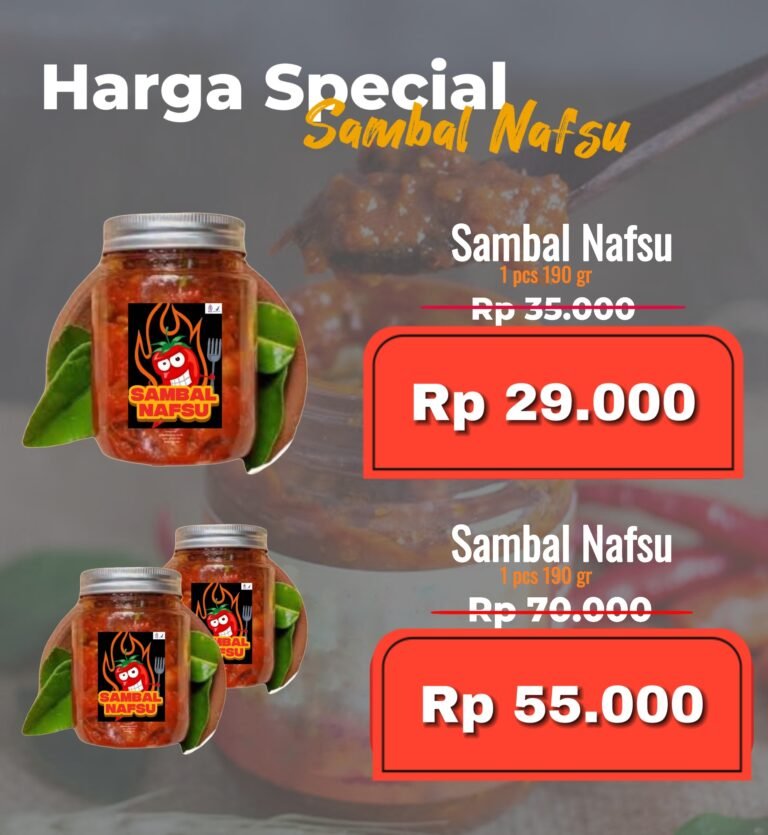 Sambal nafsu makan adalah sambal khas Indonesia yang terbuat dari bahan-bahan alami pilihan seperti cabai segar, bawang putih, bawang merah, tomat, dan rempah-rempah khas nusantara. Diproses secara higienis tanpa bahan pengawet, sambal ini cocok untuk semua jenis hidangan dan selera pedas.